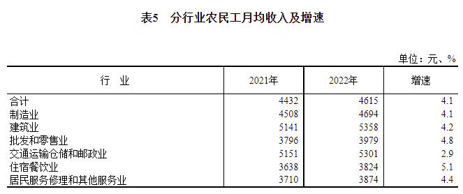 分行业看,六大行业收入均保持增长。从事制造业农民工月均收入4694元,比上年增加186元,增长4.1%;从事建筑业农民工月均收入5358元,比上年增加217元,增长4.2%;从事批发和零售业农民工月均收入3979元,比上年增加183元,增长4.8%;从事交通运输仓储和邮政业农民工月均收入5301元,比上年增加150元,增长2.9%;从事住宿餐饮业农民工月均收入3824元,比上年增加186元,增长5.1%;从事居民服务修理和其他服务业农民工月均收入3874元,比上年增加164元,增长4.4%。