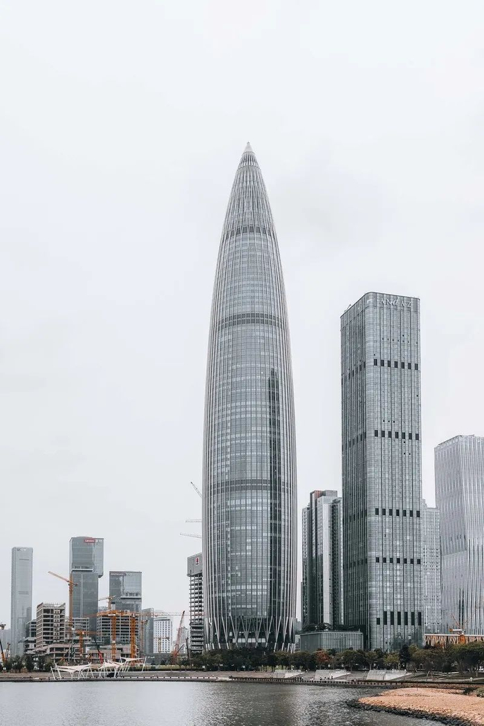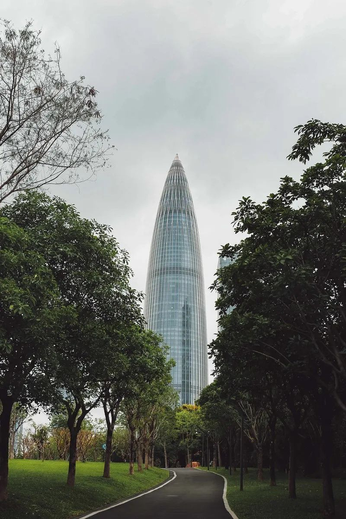 深圳后海第一高楼,五十六根钢柱支撑起整个流线型建筑,全层无柱空间,获得更高的使用率与更开阔的格局。建筑设计参考了春笋的自然形态,象征着其节节攀升的无限生命力,寓意着进取、突破与无限生长。同时,外圆内方的形制,放射性对称的布局,也是东方文化中“方圆规矩”的写照。
