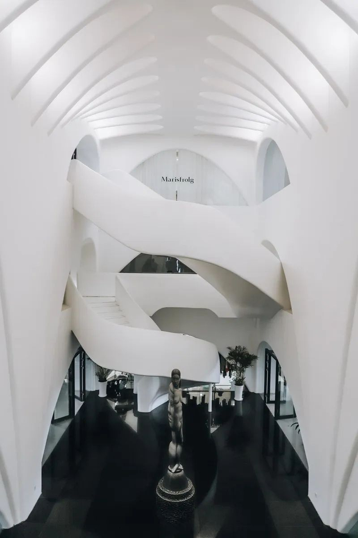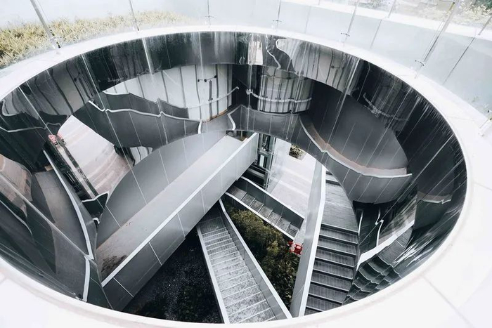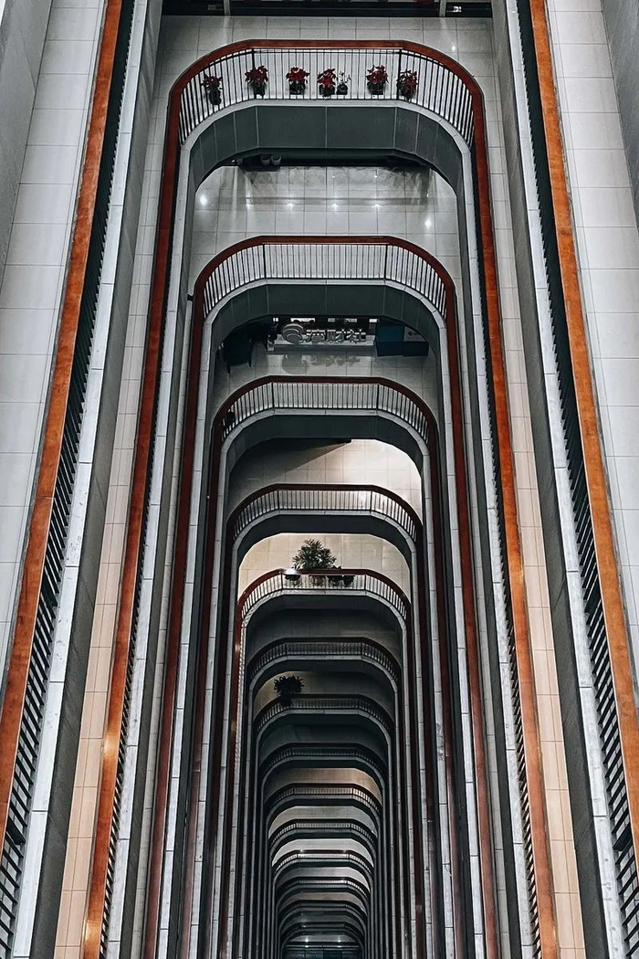 表面平淡无奇的建筑却内有乾坤,楼层间强纵深、强色彩的建筑特点带来巨大的视觉冲击,不管是从高处俯瞰还是在平地仰望,都可以收获震撼的视觉体验。