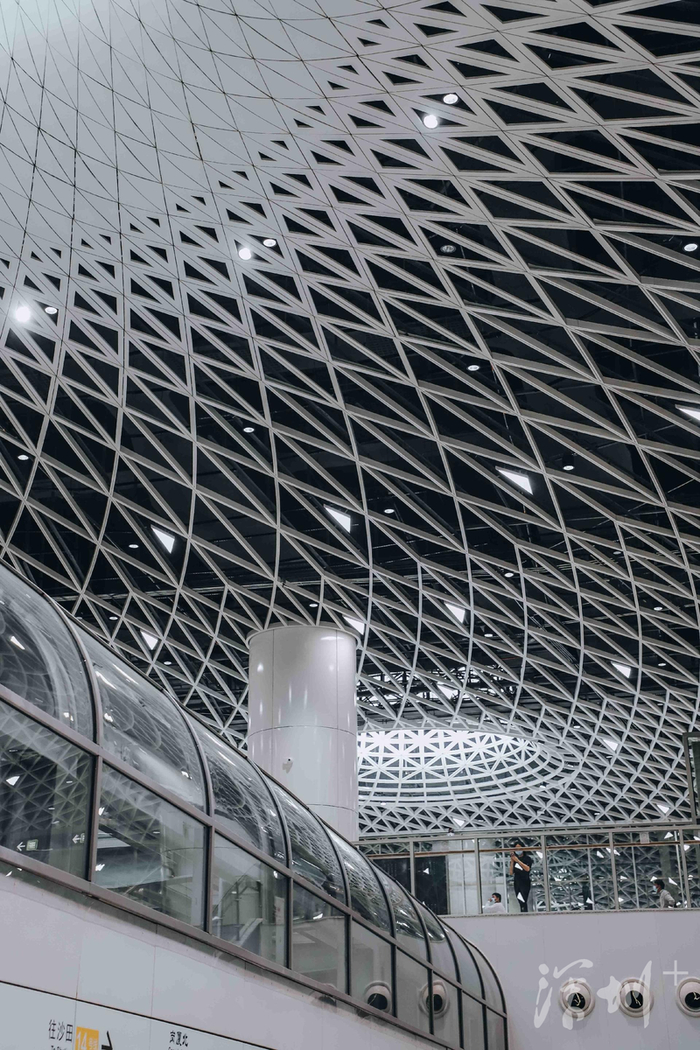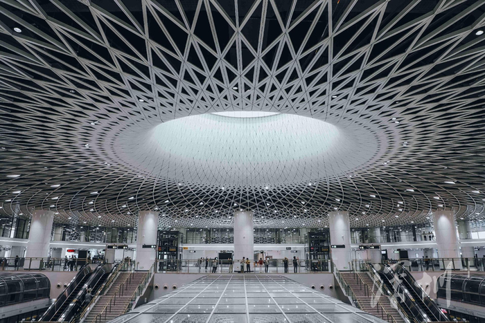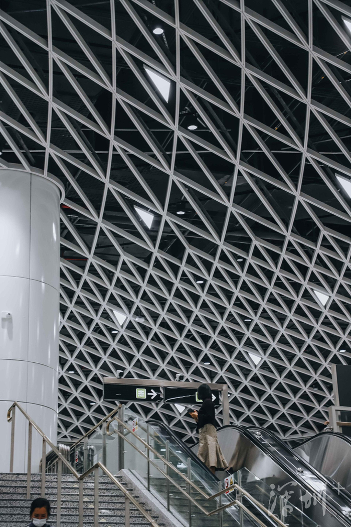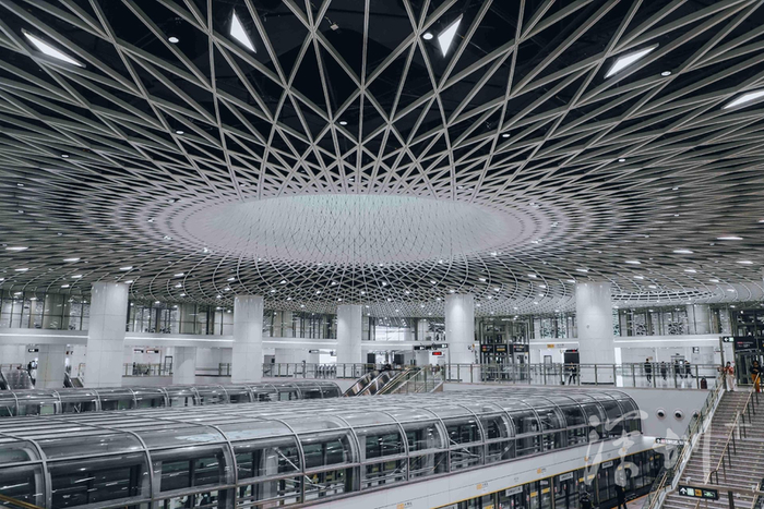超级交通枢纽岗厦北“深圳之眼” 位于福田中心区,是国内目前最大的轨道交通单体工程。该枢纽以“深圳之眼”为主题,以核心天井为基点,运用“费马螺旋”数学原理吊顶,将创意延伸到了三维空间。无数极具科技感的线条从四面汇聚于“深圳之眼”,又向八方舒展开来,如光芒四射的星,赋予空间视觉张力,呈现出深圳包容、国际化的城市气息,仿若通往未来世界的枢纽站点。