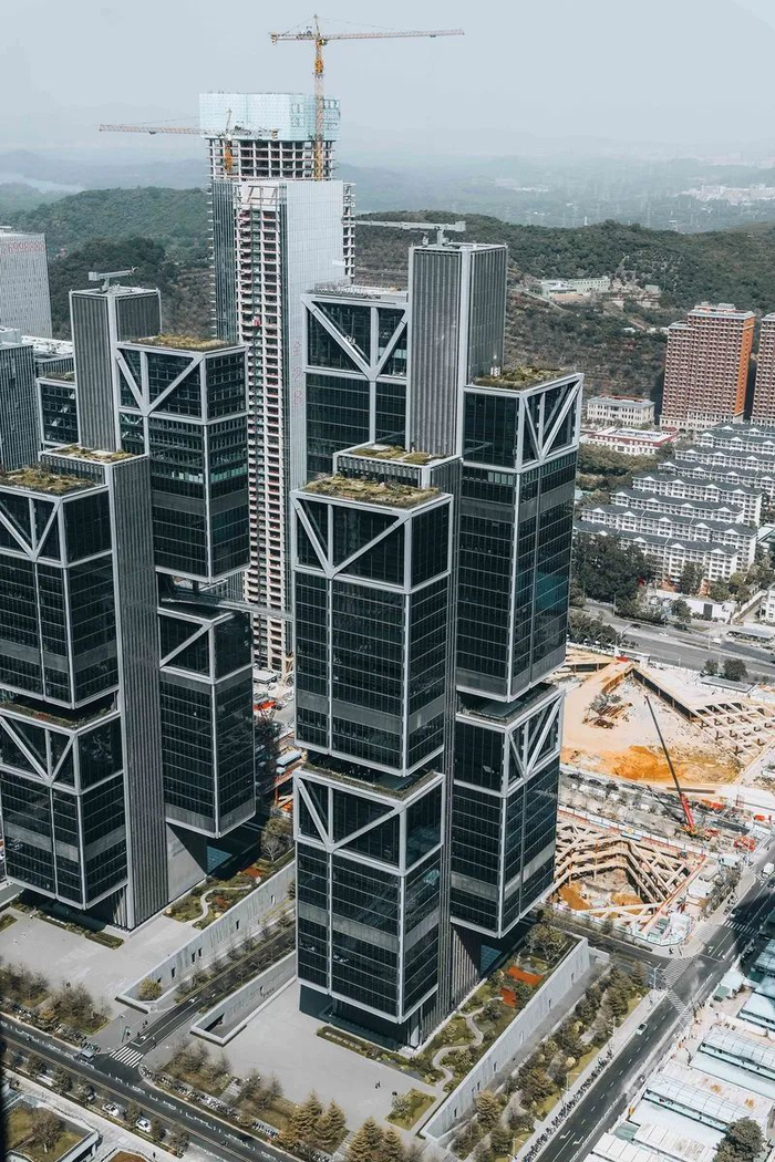 “天空之城”是大疆公司的全球总部基地。它是全球首例高度超过200米的非对称悬挂钢结构建筑,两栋塔楼以两棵大树一般的核心筒为核心,离地而起,分别向外悬挂起12个错落有致的玻璃体块。塔楼间一座极具张力的钢结构悬索桥,如一片羽毛般轻巧连接起两座塔楼,大体块的结构与桥的纤薄形成悬殊对比的美感。