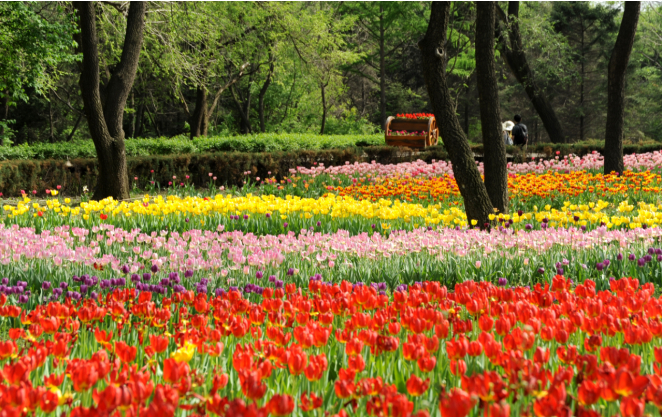 沈阳世博园第十七届郁金香花展展出时间为4月末至5月中旬,展出地点为南区宿根花卉园内,共计展出近50个品种,除常规品种外,新引进花边葡萄酒、黑豆、海地、水晶星、狐狸、热情鹦鹉等花色特殊的品种。60余万株郁金香随风摇曳,将年轮化作花带,并自然地融入森系景观小品,如白雪公主和七个小矮人、酣睡的精灵、可爱的蘑菇屋、梦幻气球飞屋等,生动地给游客朋友展现了一幅奇幻的童话世界。