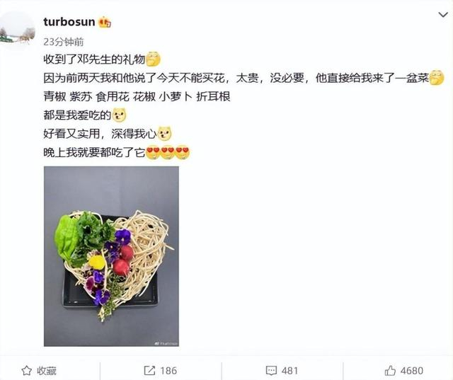 下午,孙俪晒出邓超送的情人节礼物写道:“收到了邓先生的礼物,因为前两天我和他说了今天不能买花,太贵,没必要,他直接给我来了一盆菜。青椒紫苏食用花花椒小萝卜折耳根都是我爱吃的。好看又实用,深得我心,晚上我就要都吃了它!”