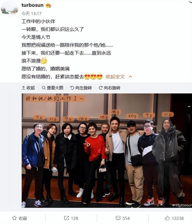 当天中午,孙俪发微博晒出有邓超的大合照写道:“工作中的小伙伴,一转眼,我们都认识这么久了,今天是情人节,我想把祝福送给一路陪伴我的那个他/她……接下来,我们还要一起走下去……直到永远,浪不浪漫?愿结了婚的,婚姻美满,愿没有结婚的,赶紧谈恋爱。”
