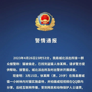 记者刚刚从阜南县警方获悉,4月26日23时53分,阜南县公安局城北派出所接一群众报警称,猫被偷走,已找到盗猫人徐某辉,请求警方提供帮助。接警后,城北派出所及时出警并开展调查。