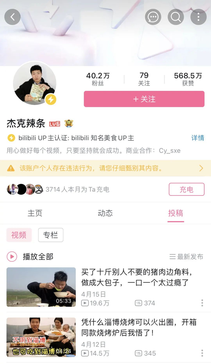 徐某辉(“杰克辣条”) 其账号在抖音拥有6万粉丝,在b站粉丝高达40万。4月27日下午其B站账号“杰克辣条”被站方贴上“该账户存在争议”的标签;28日中午,该标签已被更改为:“该账户个人存在违法行为”。