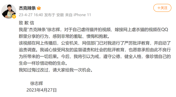 27日16时40分,@杰克辣条在微博发布致歉信。内容显示:我是“杰克辣条”徐志辉,对于自己虐待猫并拍视频、嫁接网上虐杀猫的视频在QQ群里分享的行为,感到非常的羞耻、懊悔和抱歉。该视频在网上传播后,公安机关、网信部门已对我进行了严厉批评教育,并启动了追责调查。