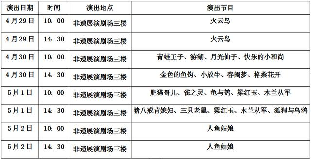 4月29日至5月2日,湖南省木偶皮影艺术保护传承中心将有8场演出,包括《火云鸟》《金色的鱼钩》《青蛙王子》《三只老鼠》《人鱼姑娘》等,陪孩子们欢度“五一”。