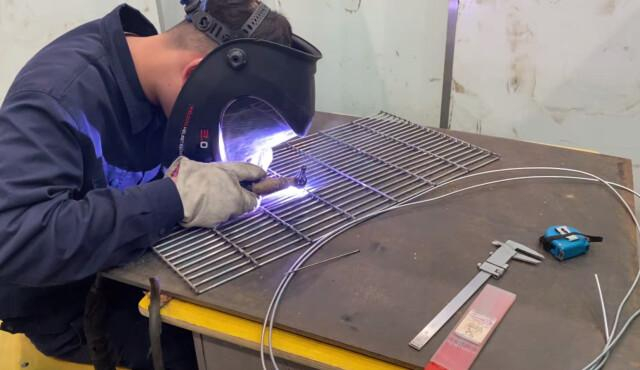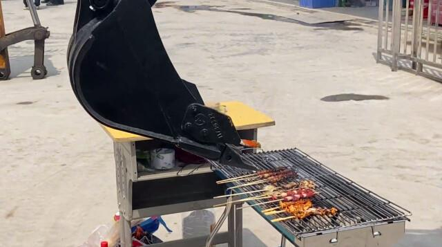 别看只是一顿烧烤,用挖掘机完成烧烤中刷酱这个看似简单的动作并不容易。因为挖掘机幅度较大,焊接专业的学生周志达自己动手焊接了一个适合挖掘机操作的烧烤架。