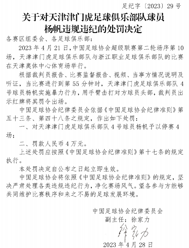 关于对天津津门虎足球俱乐部队球员杨帆违规违纪的处罚决定