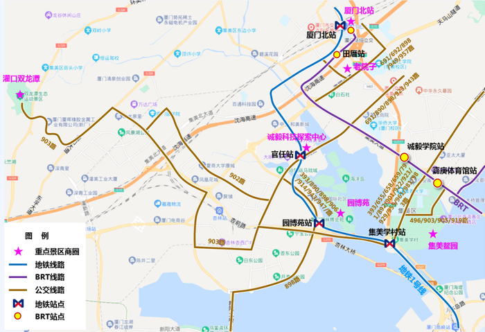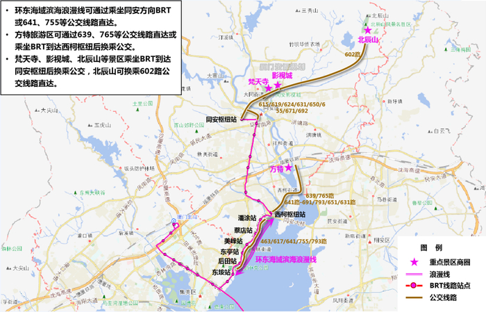 36个重点景区商圈中,12处分布在思明区,8处分布在湖里区,此外,集美区6处、海沧区3处、同安区4处、翔安区3处。其中较多景区可以通过公共交通串联,最大程度缓解交通压力,建议市民乘坐公共交通前往景区。