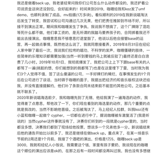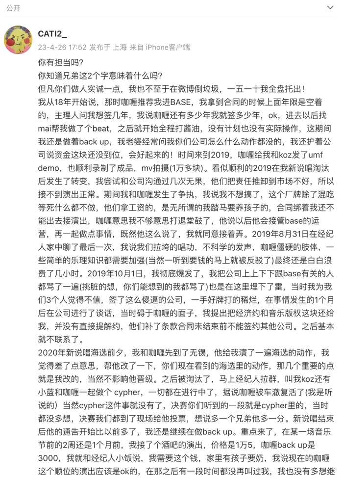 CATI2的长文中可以梳理出来的故事线大概如下:GALI在2018年邀请了自己的好兄弟CATI2加入了当时一家名为BASE的音乐公司。在加入BASE之后,作为公司旗下的音乐人,CATI2几乎没享受到任何音乐资源以及扶持,在公司5年之久,仅仅是公司牵线搭桥让当时出名的说唱音乐制作人MAI给CATI2做了一首伴奏。