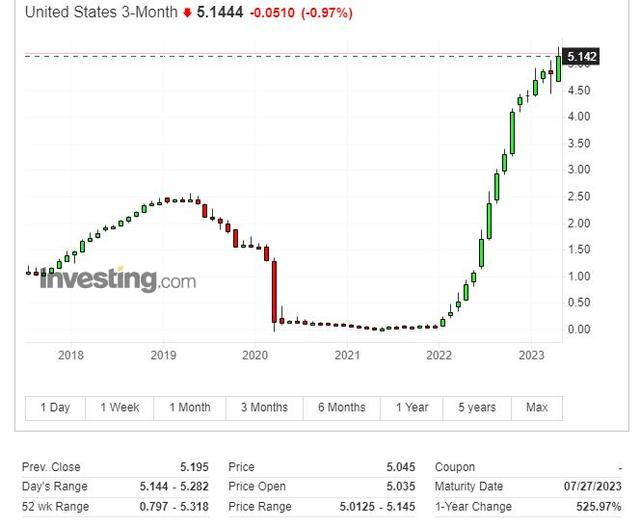 与此同时,投资者还要求于美国潜在债务违约日期前后到期的短期美债支付更高收益率,以补偿他们可能无法获得支付的风险,例如3个月期美债收益率上周触及5.318%,创二十二年最高。