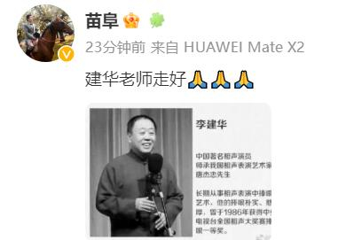 苗阜称,今年正计划着邀请李建华老师去西安参加相声节,没想到他却猝然离世,这成了苗阜心中永远的遗憾。“在相声行内,李建华和我同辈,我年龄小,他是我师哥。他对我特别照顾,人特好。”苗阜禁不住内心的悲痛,在社交媒体上发文痛悼,“建华老师走好!”