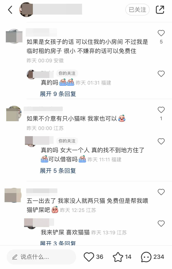 发帖后,小袁很快得到很多网友的回应,“大部分给我留言的网友都要去其他城市旅游,房子就空出来了,他们开出的价格在200元左右;有一些是单独居住的女孩子,她们觉得再住进一个女生也可以,不用给钱;还有一些人说不需要支付房费,每天帮忙他们喂一下宠物就行。”