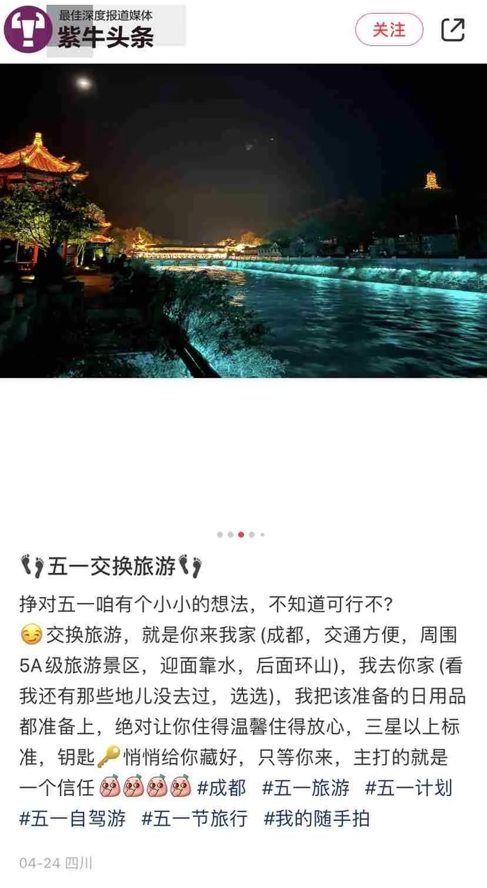 五一假期临近,在社交平台上,很多网友公开发帖称想寻找伙伴到对方城市旅游,“交换式旅游”一时兴起。