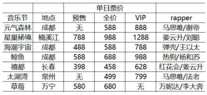 当时,温州一场音乐节的全价票卖到了988元,成都一场音乐节双日VIP通票高达2999元!