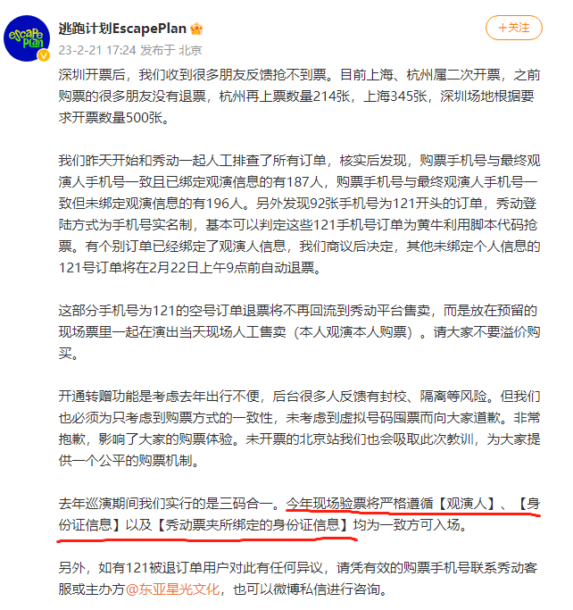 年初,逃跑计划乐队就与秀动平台人工核查售出门票,取消了92张绑定同一虚拟手机号的门票。当时,逃跑计划乐队在微博表示:“深圳开票后,我们收到很多朋友反馈抢不到票。发现92张手机号为121开头的订单,秀动登录方式为手机号实名制,基本可以判定这些121手机号订单为黄牛利用脚本代码抢票。”