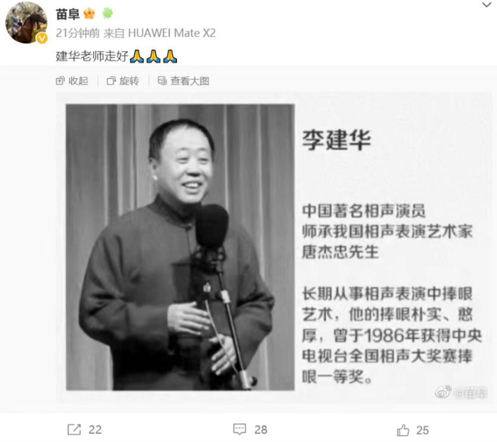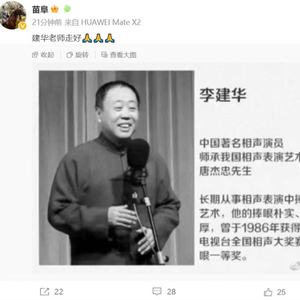 4月28日晚,相声演员苗阜在社交媒体发布了66岁的著名相声演员李建华去世的消息,并悼念道:“建华老师走好。”记者联系了与李建华合作多年的相声表演艺术家李金斗,证实了消息。