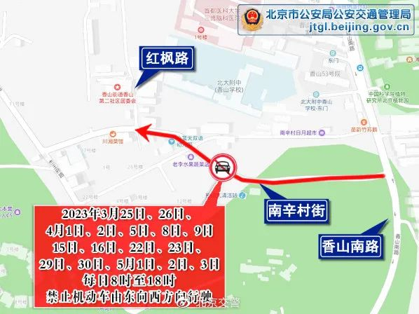 特别提示去往香山地区游玩的市民朋友,4月29日至5月3日的8时至18时,南辛村街(红枫路至香山南路段)禁止机动车由东向西方向行驶。