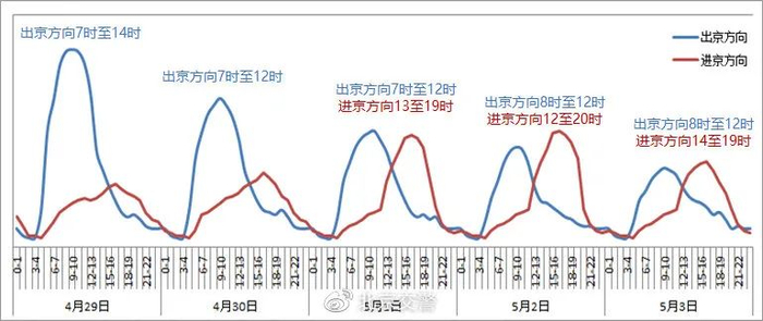 “五一”小长假第一天,北京市交通委预测,4月29日为假期首日,是出京方向交通压力最大日,上午7时-12时高速公路出京方向交通压力将持续较为集中,8时-11时最为突出,全日交通量将达假期峰值、有望创历史新高。