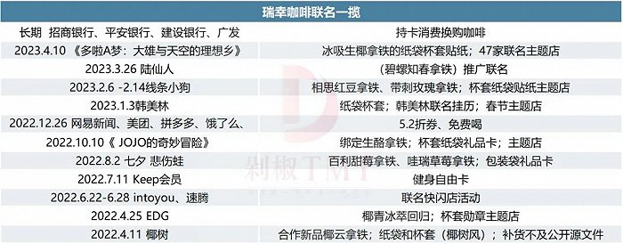 在统计时间内,瑞幸的可计次联名共有10次,排在榜内第三,热度较高的几次联名有:《多啦A梦:大熊与天空的理想乡》、线条小狗、《JOJO的奇妙冒险》以及和椰树牌椰汁的合作,主要为备受年轻人喜爱的网红动画IP。其余联名大部分为时节性较强的人物或品牌联名,以只推出周边设计和联名快闪店为主。