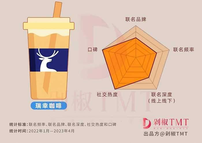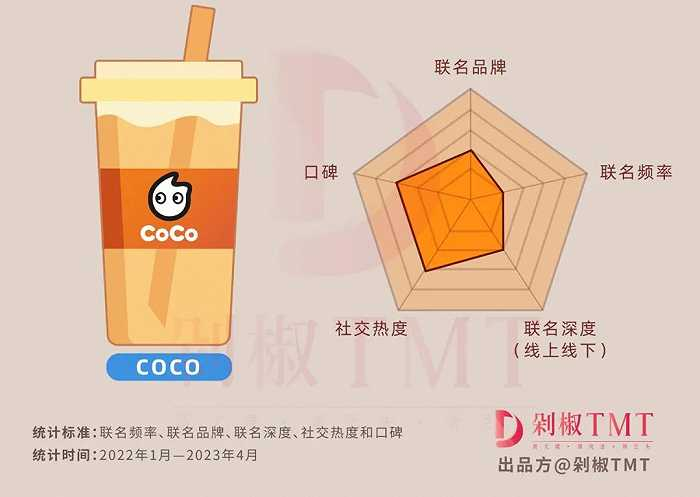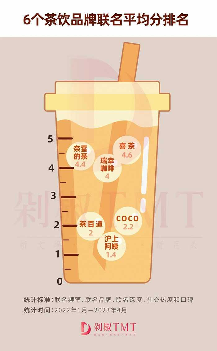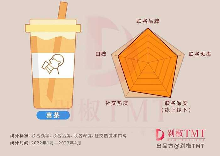 根据统计,喜茶从2022年1月1日至2023年4月21日共有官宣联名17个,总体联名频率是夏季(旺季)大约半个月一次,冬季(淡季)平均一个月一次。