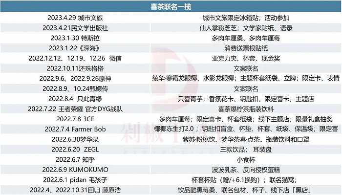 喜茶联名的品牌IP类型有:艺术家(藤原浩)、消费品品牌(3CE、Pidan、KUMO KUMO、ZEGL等)、影视文化IP(《梦华录》《只此青绿》《深海》等)、电竞IP(原神、王者荣耀DYG战队)、平台官方(人民文学出版社、微信、知乎等),临近五一,喜茶还联动各个城市的文旅局,推出了城市限定冰箱贴,引起一股喝喜茶收集冰箱贴的热潮。