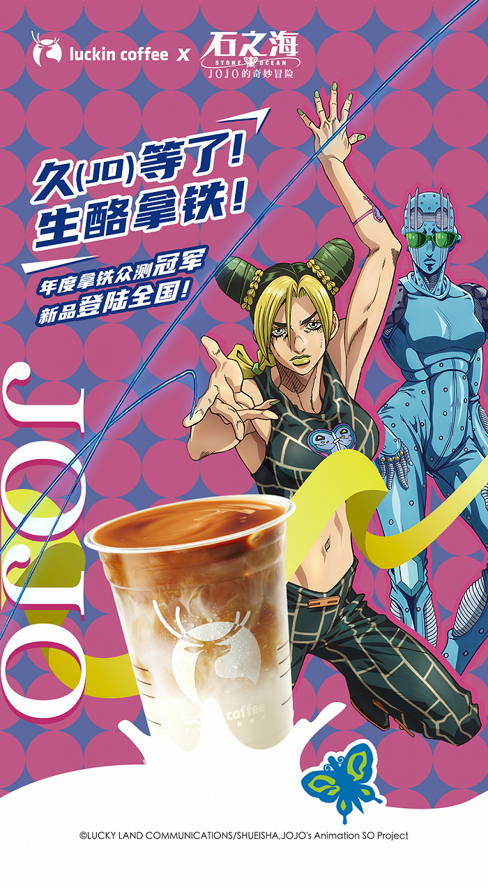例如与《JOJO的奇妙冒险:石之海》的联名就是为2022年瑞幸的年度大单品“生酪拿铁”做配套宣传的,而《JOJO的奇妙冒险》本身作为小众IP为何被选中,也正是因为背靠2022年10月的7000家门店,通过瑞幸和“生酪拿铁”的带动不愁将小众粉丝群的喜爱转化为购买力。