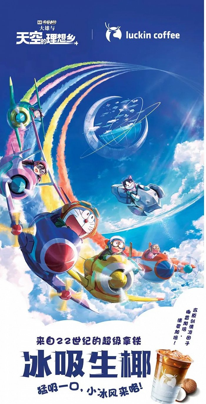 而近期和《多啦A梦:大雄与天空的理想乡》的联名声量几乎被暂时绑定的单品“冰吸生椰拿铁”营销趋势淹没,由于瑞幸的生椰拿铁成为销冠王,2年销量达到3亿杯,冰吸生椰拿铁的营销直接对焦生椰拿铁的夏季清凉版,首周即达到销量666万杯的成绩,和《哆啦A梦》的联名则被安排为次营销重点。