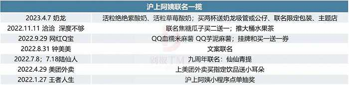 沪上阿姨从2022年1月起至今共有8次联名,主要联名对象为网络红人IP,有网红Q宝、钟美美、陆仙人,联名内容上除了和Q宝合作推出“QQ血糯米麻薯”和“QQ芋泥麻薯”以及九周年和陆仙人的合作中推出“仙仙青提”之外,其他并无任何产品内容上的渗入,甚至有全线周边内容的联名也寥寥无几,大多只是文案联名或者促销活动联名。