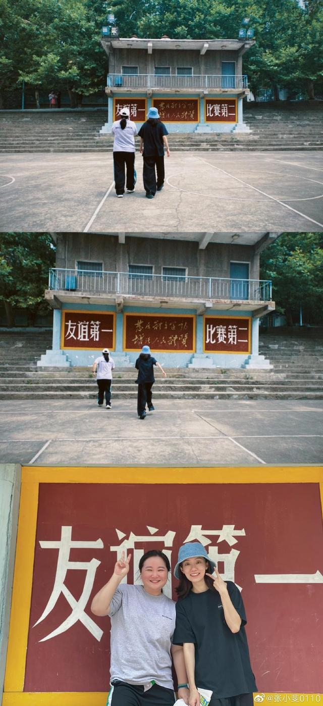 合照中,二人重返《你好,李焕英》的取景拍摄地,贾玲穿灰色短袖和黑色裤子,看上去瘦了不少,张小斐穿一身黑衣,姐妹俩一起奔跑比V,满脸笑容。