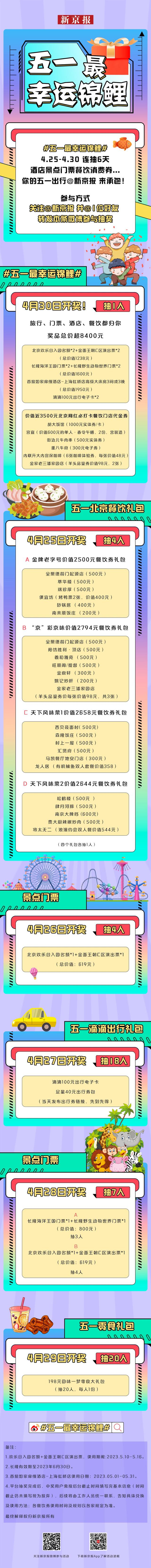 “五一”小长假即将到来,新京报、北京烹饪协会联合众多知名企业,一起发起#五一最幸运锦鲤#活动,连续6天在微博发起抽奖,向消费者送出餐饮消费券、景点门票、酒店消费券、出行代金券等,持续助力推动消费复苏。“五一最幸运锦鲤”抽奖活动将一直持续到4月30日,读者可在微博关注@新京报并@1位好友,转发#五一最幸运锦鲤#微博参与抽奖。