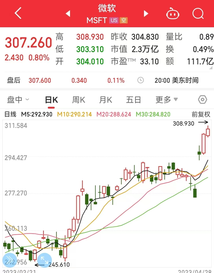 截至美东时间4月28日收盘,微软报307.26美元,涨幅0.80%,市值2.3万亿美元。
