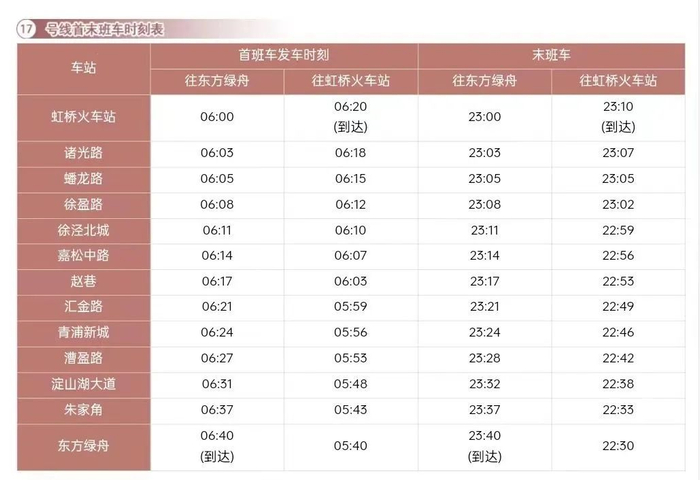 旅客可选择乘坐地铁2、10、17号线抵达虹桥火车站前往目的地,三条地铁线路的首末班车时刻表及虹桥火车站出门口,见下图。