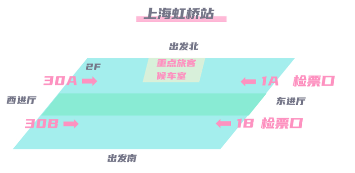 上海虹桥火车站四面都有进站口,检票口序号从东向西递增。