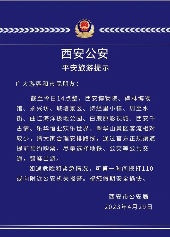 截至今日14点整,西安博物院、碑林博物馆、永兴坊、城墙景区、诗经里小镇、周至水街、曲江海洋极地公园、白鹿原影视城、西安千古情、乐华恒业欢乐世界、翠华山景区客流相对较少,请大家合理安排路线,通过官方正规渠道提前预约购票,尽量选择地铁、公交等公共交通,错峰出游。如遇危险和紧急情况,可第一时间拨打110 或向附近公安机关报警。祝您假期安全愉快。