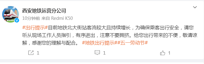 目前地铁北大街站客流较大且持续增长,为确保乘客出行安全,请您听从现场工作人员指引,有序进出,注意不要拥挤。给您出行带来的不便,敬请谅解,感谢您的理解与配合。