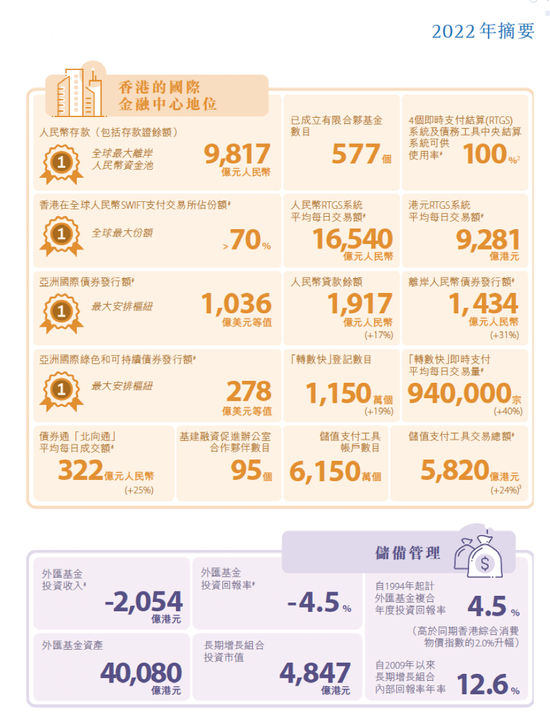“2022年是迎难而上的一年,尽管面对重重挑战,金管局仍致力保障香港货币与金融稳定,并于主要策略范畴推进多项有利发展的措施,进一步巩固香港的国际金融中心地位”,香港金管局行政总裁余伟文表示。