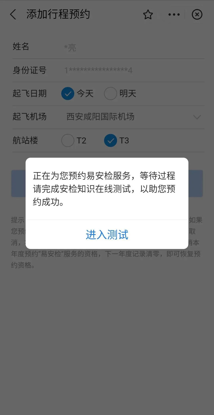 第四步:首次预约旅客需回答三道安检问题,答完后即可预约“易安检”服务,答题的准确率不影响易安检服务的预约率。