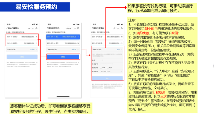 旅客需在航班出发前48小时内,在支付宝 “民航公安服务”小程序端完成实名认证,经后台审核通过的旅客可预约此服务,预约成功即可查看易安检通道引导信息。旅客到达安检现场后,即可进入“易安检”专用通道体验“易安检”服务。