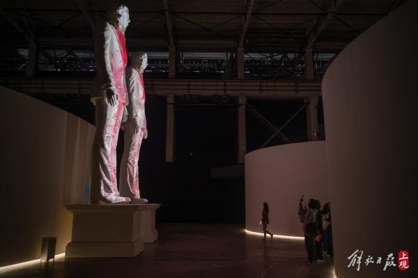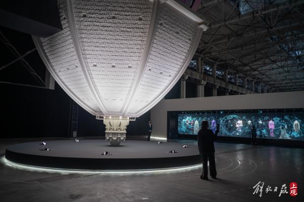 离开生机盎然的“伊甸花园”,迎面而来的是一对高达十米的巨型白色雕像。这对以“偶”命名的雕像,在多媒体光影的投射下不断变换套装的纹样,致敬中性时尚观念。