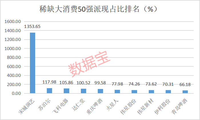 能赚钱、会赚钱,50强股票对股东也超级大方,去年派现比例中位数高达49%,高出A股派现公司派现比例中位数16个多百分点。其中,宋城演艺、苏泊尔、飞科电器、达仁堂等公司派现比例在100%以上,重庆啤酒、火星人、伟星股份等公司派现比例超过70%。