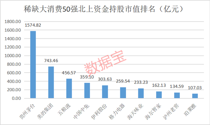 稀缺大消费50强股票的优质特质,吸引了众多机构的青睐。其中市值最高的贵州茅台一季度末获得了1700多家机构持仓,五粮液获得了1000多家机构持仓。即便是市值最低的伟星股份,也有20多家机构重仓。北上资金也是持仓大户,持有50强股票最新市值超过5291亿元,贵州茅台、美的集团、五粮液等个股最新持股市值均超400亿元。