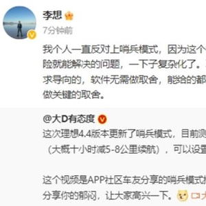 而就在此次消息发布前,理想汽车CEO李想曾在社交平台发文称:“个人一直反对哨兵模式,因为这个模式反而增加了车主的焦虑和困扰,将原本保险就能解决的问题复杂化了。不过软件层面是完全用户需求导向,无需做取舍,能给的都给。”目前该条内容已被删除。