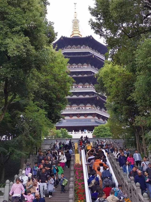 下午,雷峰塔下的电梯载满游客,不时有语音提醒游客注意脚下安全。而在雷峰塔内部,计划登高的游客也挤满大厅,上塔时难以挪动脚步。图/九派新闻 曾金秋