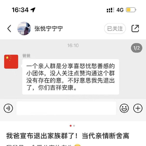 次日下午,张爸爸发了这样一条消息:一个亲人群是分享喜怒、忧愁善感的小团体,没人关注点赞沟通,这个群没有存在的意(义)。随后,他便退出了群聊。