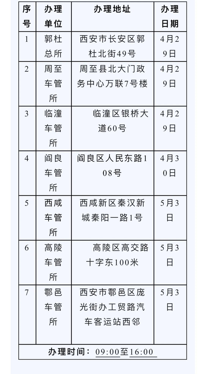 为了方便广大群众办理车驾管业务,五一假期,西安市公安局交警支队车辆管理所在郭杜总所、鱼化寨机动车登记服务站、西咸新区车管所及5个远郊区县车管所,继续为群众办理12项窗口业务,并增加3000人次驾驶人考试计划及机动车登记业务。(记者 张佳)
