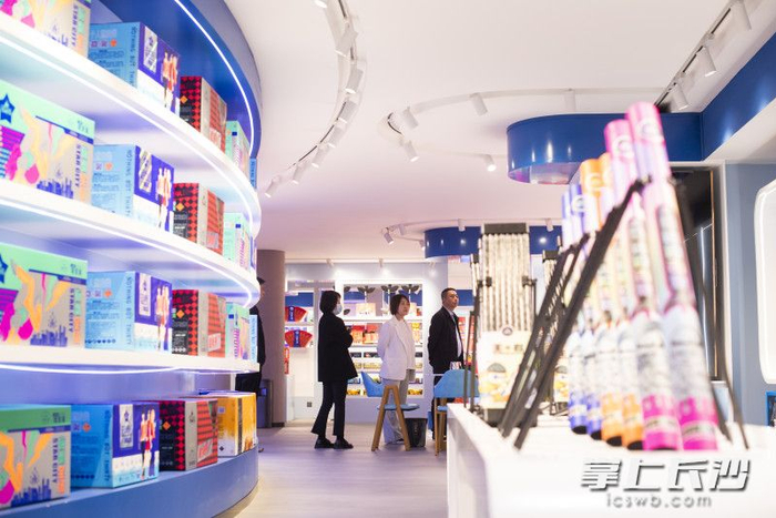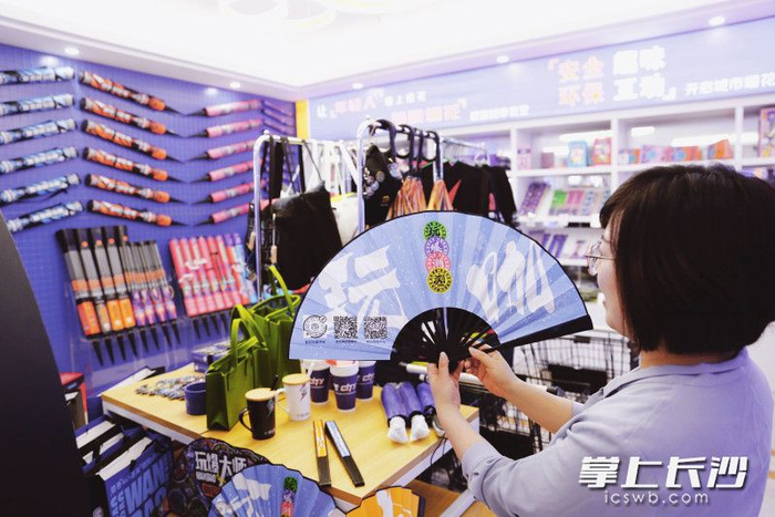不远处的银洋烟花集团,展厅里除了琳琅满目的小型城市烟花产品外,还有各种“脑洞大开”的烟花文创产品——折扇、雨伞、杯子、文化衫等。