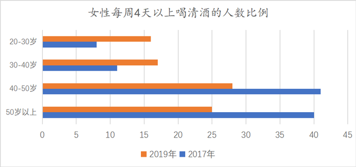 随着日本清酒多元化发展,出现气泡清酒、果味清酒等新产品,女性消费频次与人数均在增多。每周有4天以上喝清酒的20多岁女性占到16%,比2年前调查时增加了8个百分点;30多岁女性增加6个百分点,达到17%。年轻女性清酒消费群体的不断增长,成为清酒消费中引人注目的亮点。